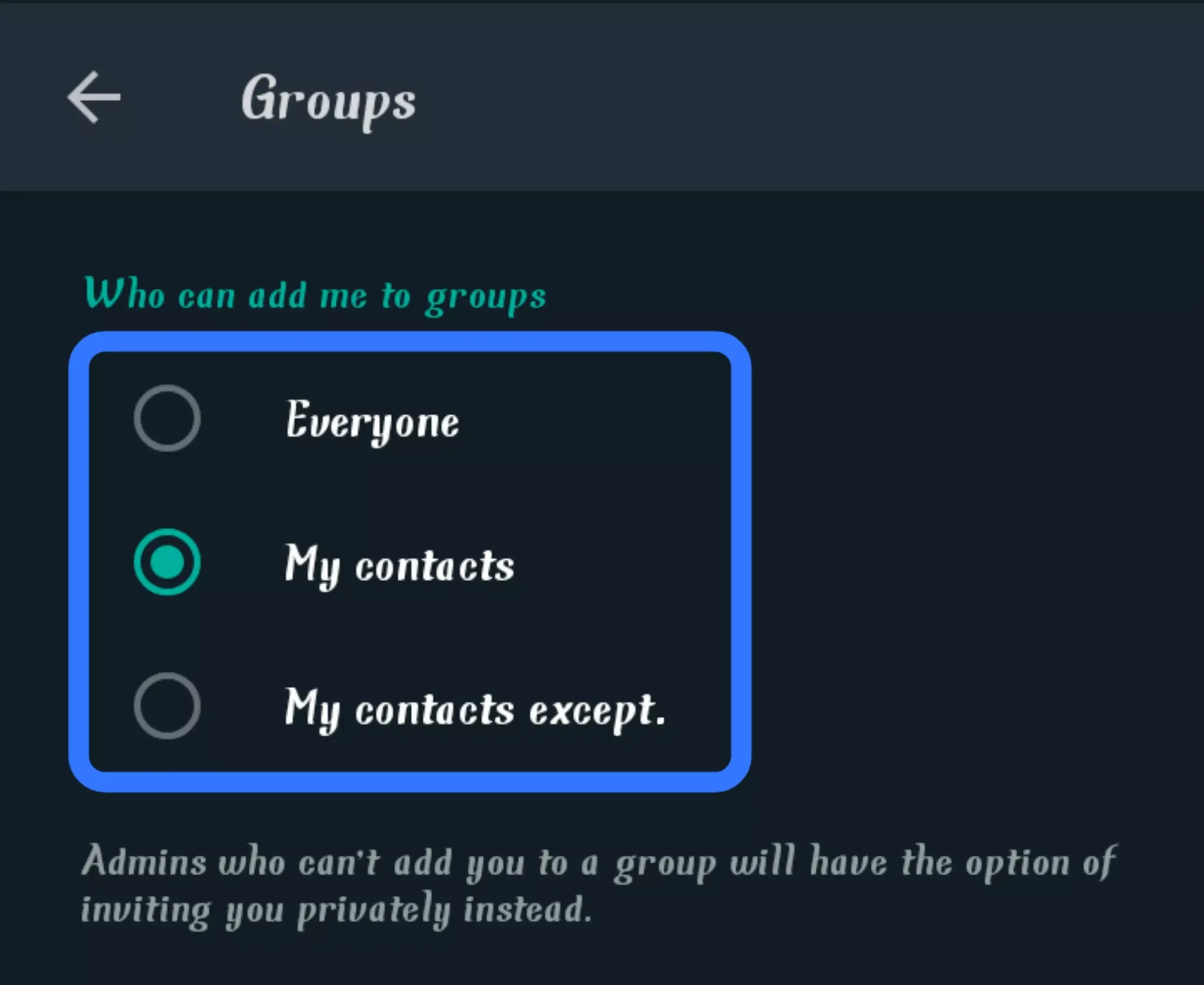 'My Contact' option केवल उस Admin को Group में user को जुड़ने की अनुमति देता है जिस Admin का WhatsApp नम्बर आपने अपने Contact List में save कर रखा हो।